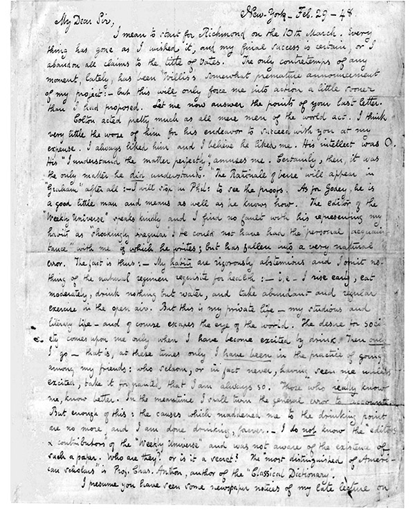 47. MS of a letter from Poe to George W. Eveleth (1 of 2 pages), February 29, 1848 — LTR-263