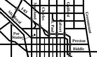 From I-83: Take I-83 (Jones Falls Expressway) to exit 5. Turn left at the first traffic light, going south on Maryland Avenue for one block. The Law Plaza and Poe statue (facing Mt. Royal Avenue) are visible on the left. Turn right on Mount Royal at the traffic signal to pass in front of the statue.